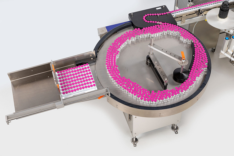 Drehteller für jedes Format. Der Rundum-Etikettierer 132M HC sorgt für Power mit höchster Zuverlässigkeit von Anfang an. Der neu entwickelte Drehteller von HERMA hat eine Magazinaufnahme für komplette Trays. Schnell zu wechselnde Formatteile lassen dabei den Einsatz verschiedener Traygrößen und Produkte zu. Mit einem Produktschwert werden die Produkte aus dem Tray auf den Teller geschoben, ohne dass ein Bediener in den rotierenden Produkttransport eingreifen muss. „Damit reduzieren wir das Risiko, dass Produkte auf dem Drehteller umfallen und den weiteren Ablauf stören“, sagt Ulrich Fischer, Leiter Produktmanagement bei HERMA Etikettiermaschinen. „Aus demselben Grund ist der Drehteller auch extrem laufruhig und vibrationsarm.“ Um das zuverlässige Leerfahren des Tellers und somit die Anforderung der „Line Clearance“ zu gewährleisten, werden die jeweils letzten Produkte mit Hilfe von Druckluft auf das Transportband befördert. Eine automatische Füllstandskontrolle hilft dabei, ungewollten Leerlauf zu verhindern. Optional erhältlich ist auch eine Schutzabdeckung für den Teller, die gerade bei Glasfläschchen den Geräuschpegel deutlich reduziert. Der Drehteller ist sowohl als Einlaufdrehteller als auch als Auslaufdrehteller für die Maschine verfügbar.