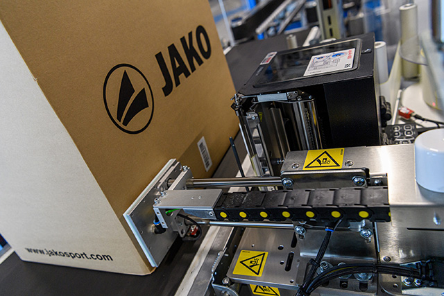 Das bei JAKO eingesetzte Etikettiersystem nennt sich Legi-Air 4050E. Da die Versandkartons von zwei Seiten mit unterschiedlich großen Labels versehen werden sollen, wurde es mit zwei verschiedenen Druckmodulen und entsprechenden Applikatoren ausgestattet, die unabhängig voneinander und demzufolge auch gleichzeitig arbeiten können. Beide Druckmodule erhalten ihre Druckinformationen über das ERP-Programm Microsoft Dynamics NAV.